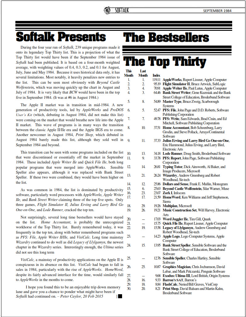This transition can be seen with some programs included on the list that were discontinued or essentially off the market in September 1984. These included Apple Writer IIe and Quick File IIe, both long popular programs that were merged into AppleWorks. Sensible Speller also appears, although it was replaced with Bank Street Speller. If these two were combined, they would have been higher on the list.