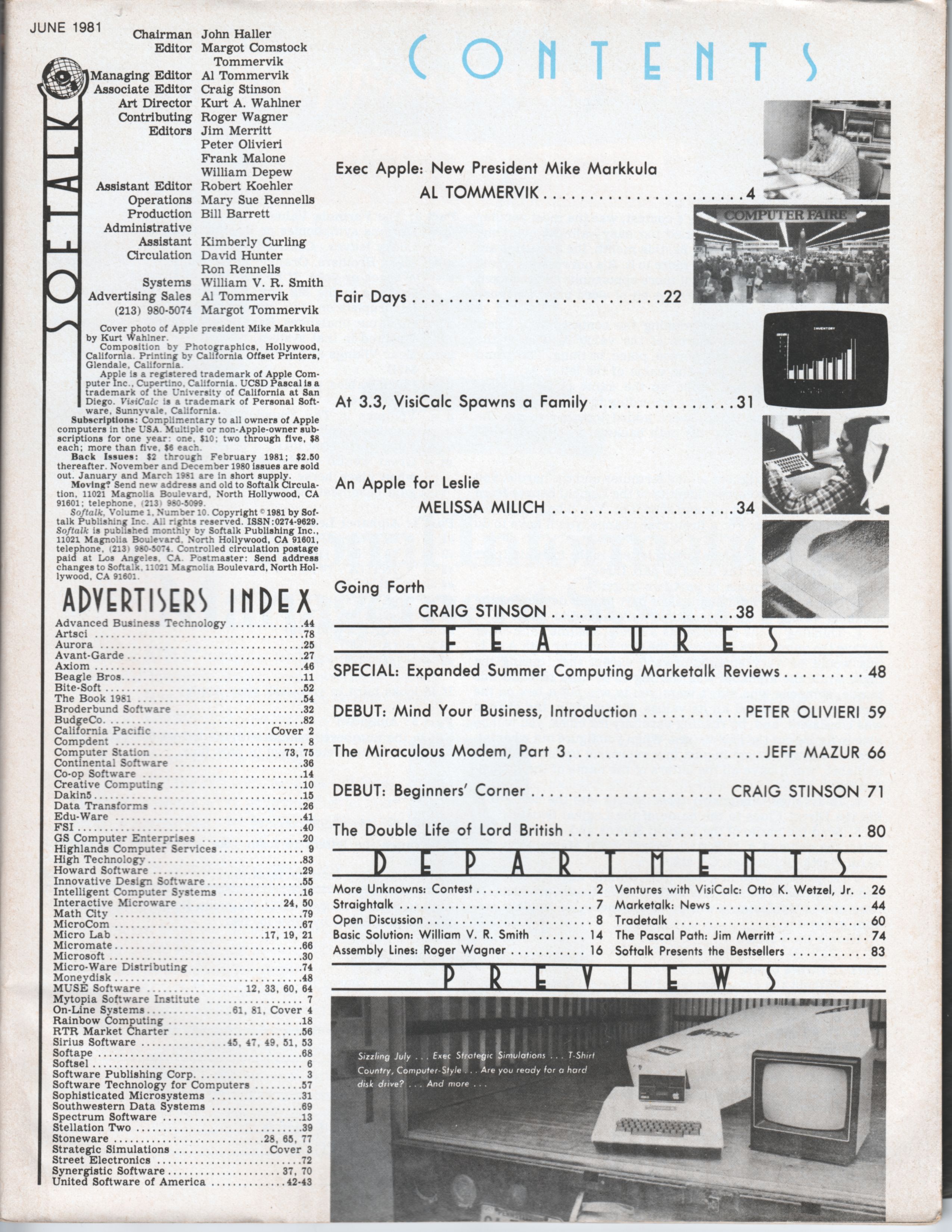Exec Apple: New President Mike Markkula. Fair Days. At 3.3, VisiCalc Spawns a Family. An Apple for Leslie. Going Forth. Five more Features plus the usual Departments.
