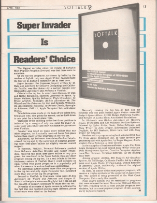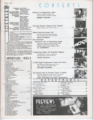 Profile of a Programmer: Nasir. The Most Popular Program Ever - Results. Where Does the Money Go? Exec Microsoft: Adventure with an Expanding Apple. A Seafaring Apple: The Mazatlan Regatta. A Self-Taught Programmer Insures His Future. The Newest Face at Summer Camp is Apple's.