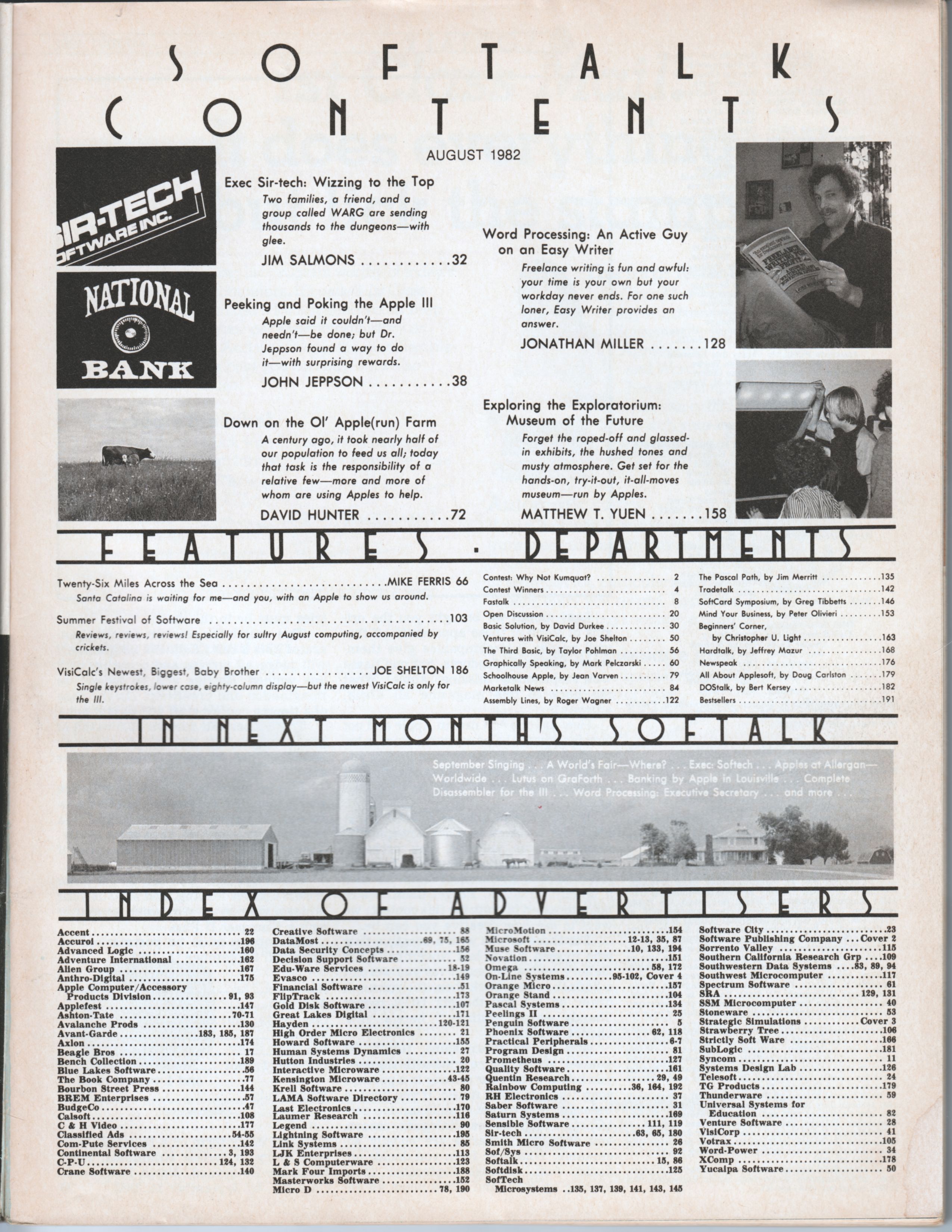 Exec Sir-tech: Wizzing to the Top. Peeking and Poking the Apple III. Down on the 0l' Apple(run) Farm. Word Processing: An Active Guy on an Easy Writer. Exploring the Exploratorium: Museum of the Future. Plus the usual Features and Departments including multi-category Bestseller lists.