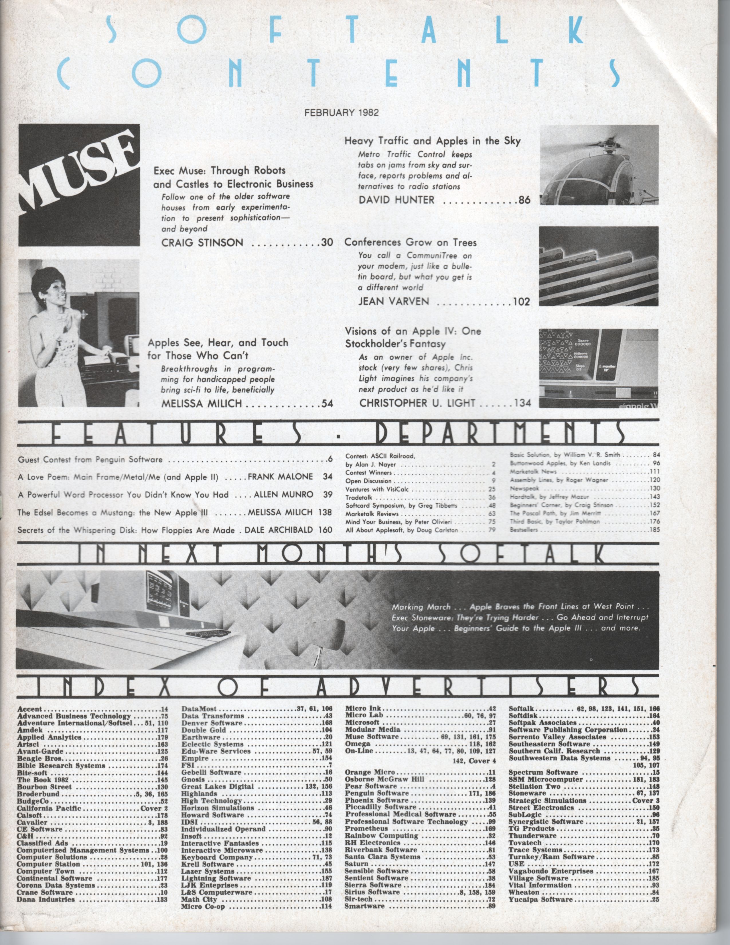 Exec Muse: Through Robots and Castles to Electronic Business. Apples See, Hear, and Touch for Those Who Can't. Heavy Traffic and Apples in the Sky. Conferences Grow on Trees. Visions of an Apple IV: One Stockholder's Fantasy. Plus five Features and usual Departments including multi-category Bestseller lists.