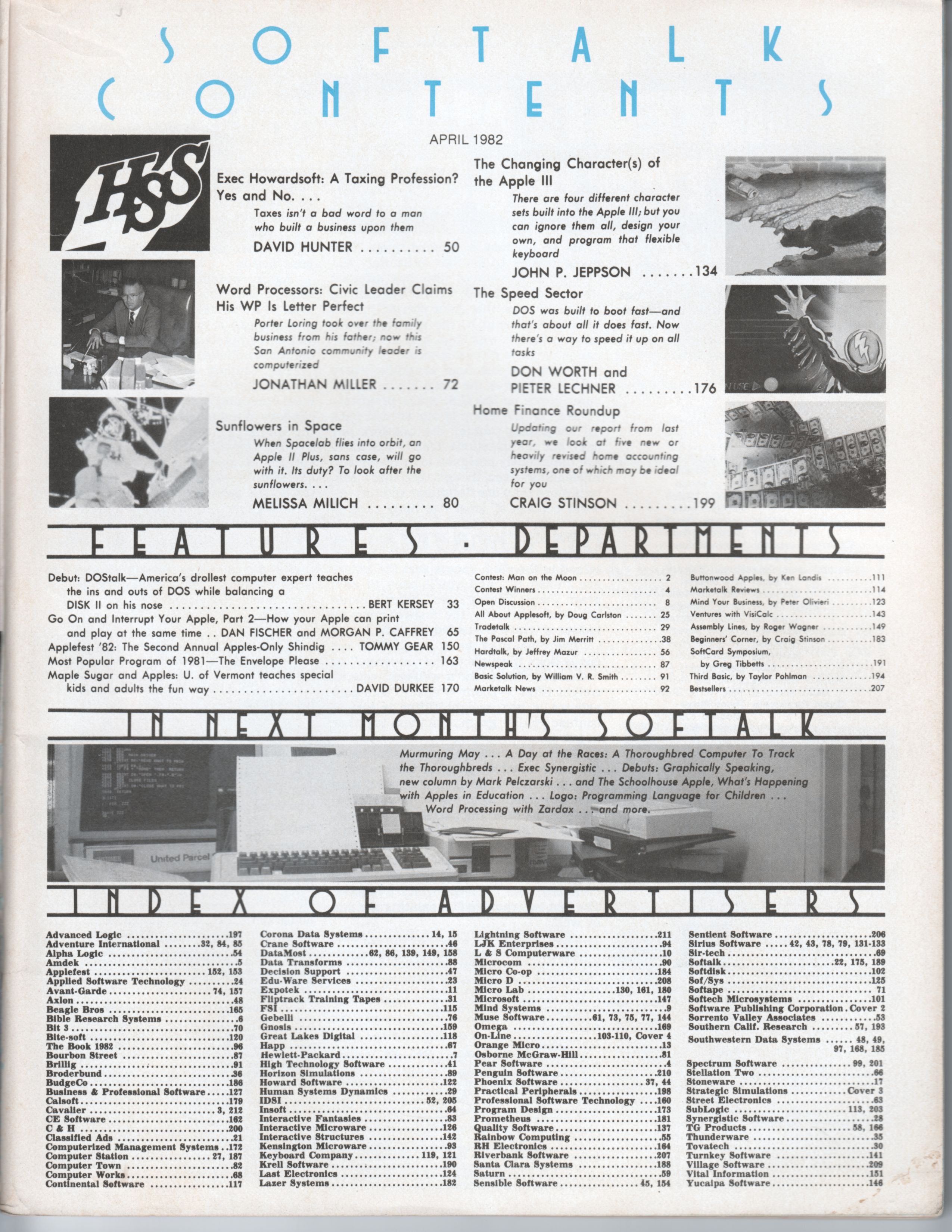 Exec Howardsoft: A Taxing Profession? Yes and No. Word Processors: Civic Leader Claims His WP Is Letter Perfect. Sunflowers in Space (AKA Apple in Outer Space on cover). The Changing Character(s) of the Apple III. The Speed Sector. Home Finance Roundup.