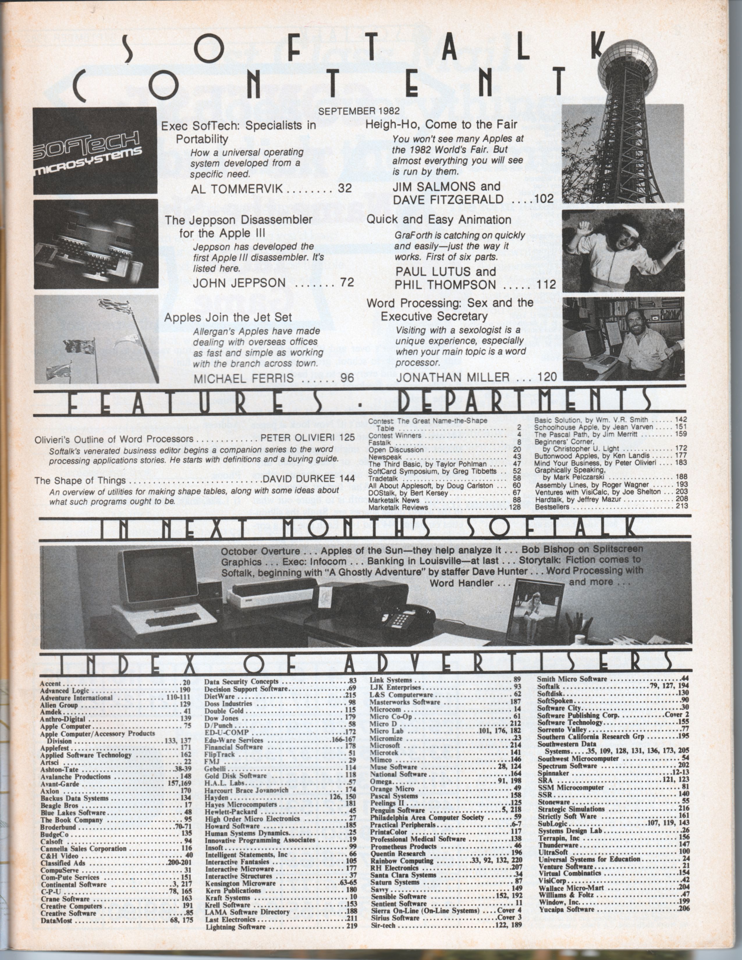 Exec SofTech: Specialists in Portability. The Jeppson Disassembler for the Apple III. Apples Join the Jet Set. Heigh-Ho, Come to the Fair. Quick and Easy Animation. Word Processing: Sex and the Executive Secretary. Plus the usual Features and Departments including multi-category Bestseller lists.