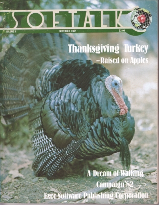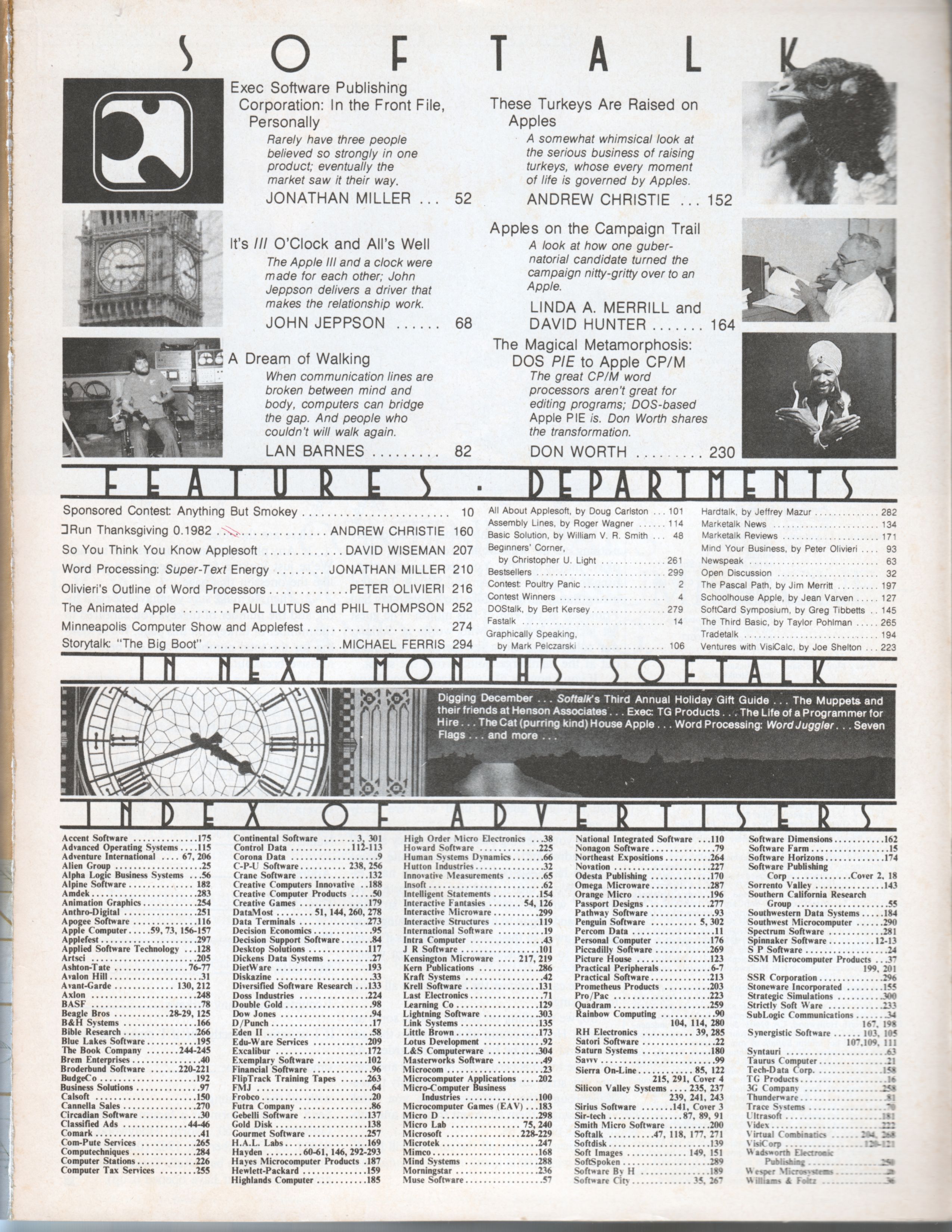 Exec Software Publishing Corporation: In the Front File, Personally. It’s III O’Clock and All’s Well. A Dream of Walking. These Turkeys Are Raised on Apples. Apples on the Campaign Trail. The Magical Metamorphosis: DOS PIE to Apple CP/M. Plus the usual Features and Departments including multi-category Bestseller lists.