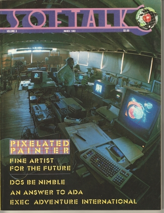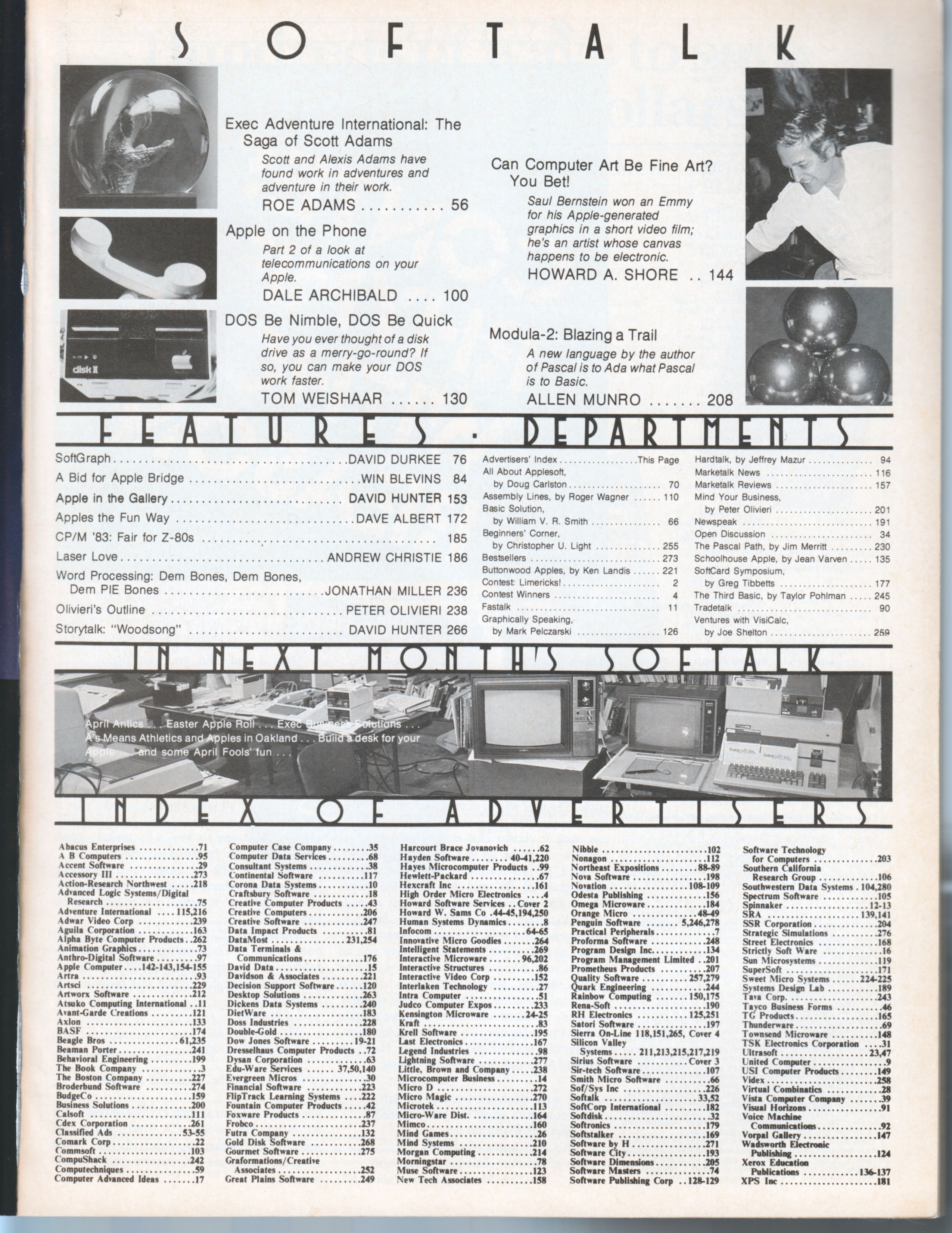 Exec Adventure International: The Saga of Scott Adams. Apple on the Phone. DOS Be Nimble, DOS Be Quick. Can Computer Art Be Fine Art? You Bet! (AKA Pixelated Painter - Fine Artist for the Future on the cover) Modula-2: Blazing a Trail. Plus the usual Features and Departments including multi-category Bestseller lists.