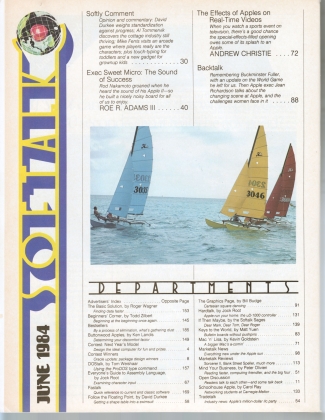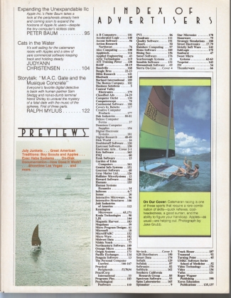 Softly Comment. Exec Sweet Micro: The Sound of Success. The Effects of Apples on Real-Time Videos. Backtalk. Expanding the Unexpandable IIc. Cats in the Water (AKA Computable Catamarans on the cover). Storytalk: "MAC. Gate and the Musique Concrete." Plus the usual Features and Departments including multi-category Bestseller lists.