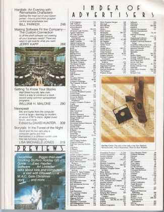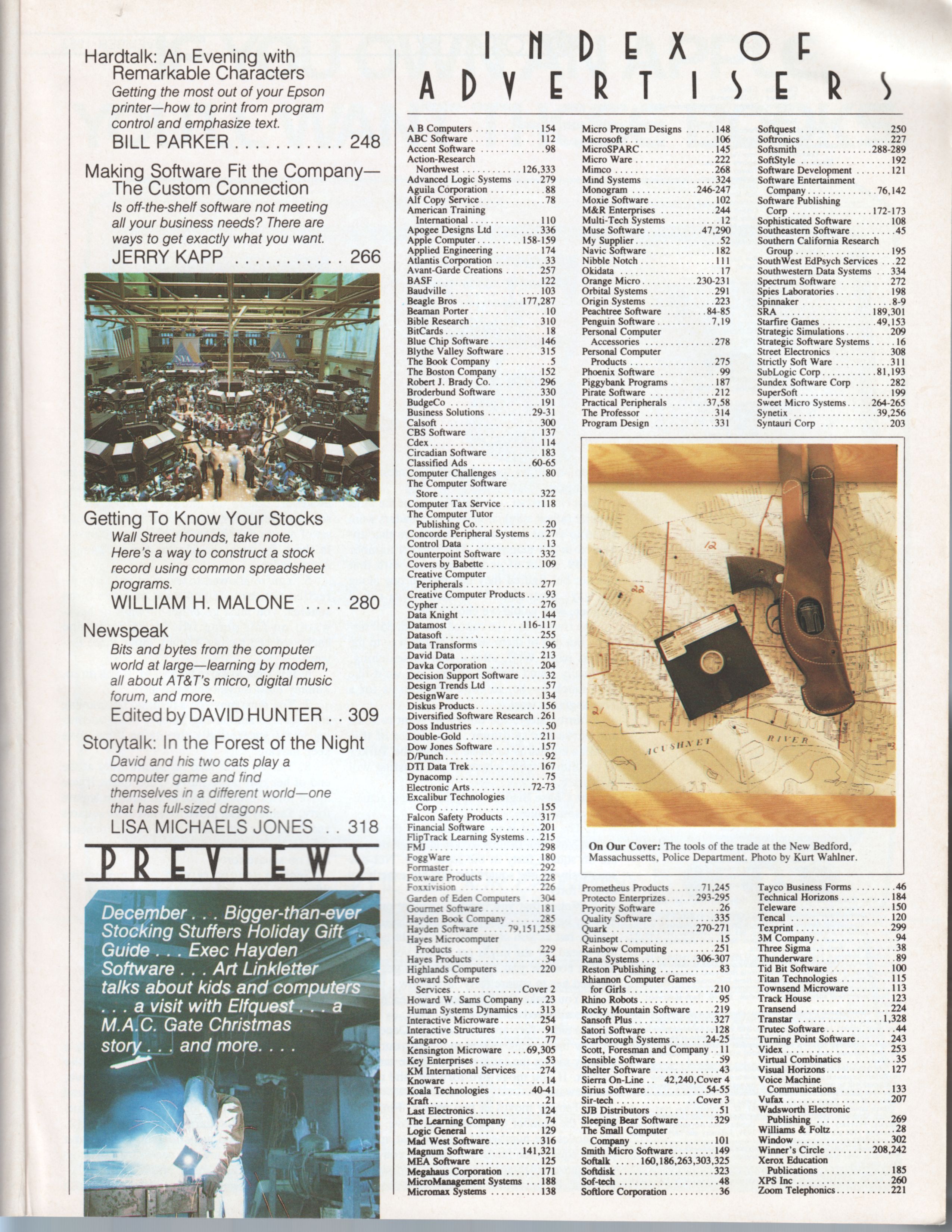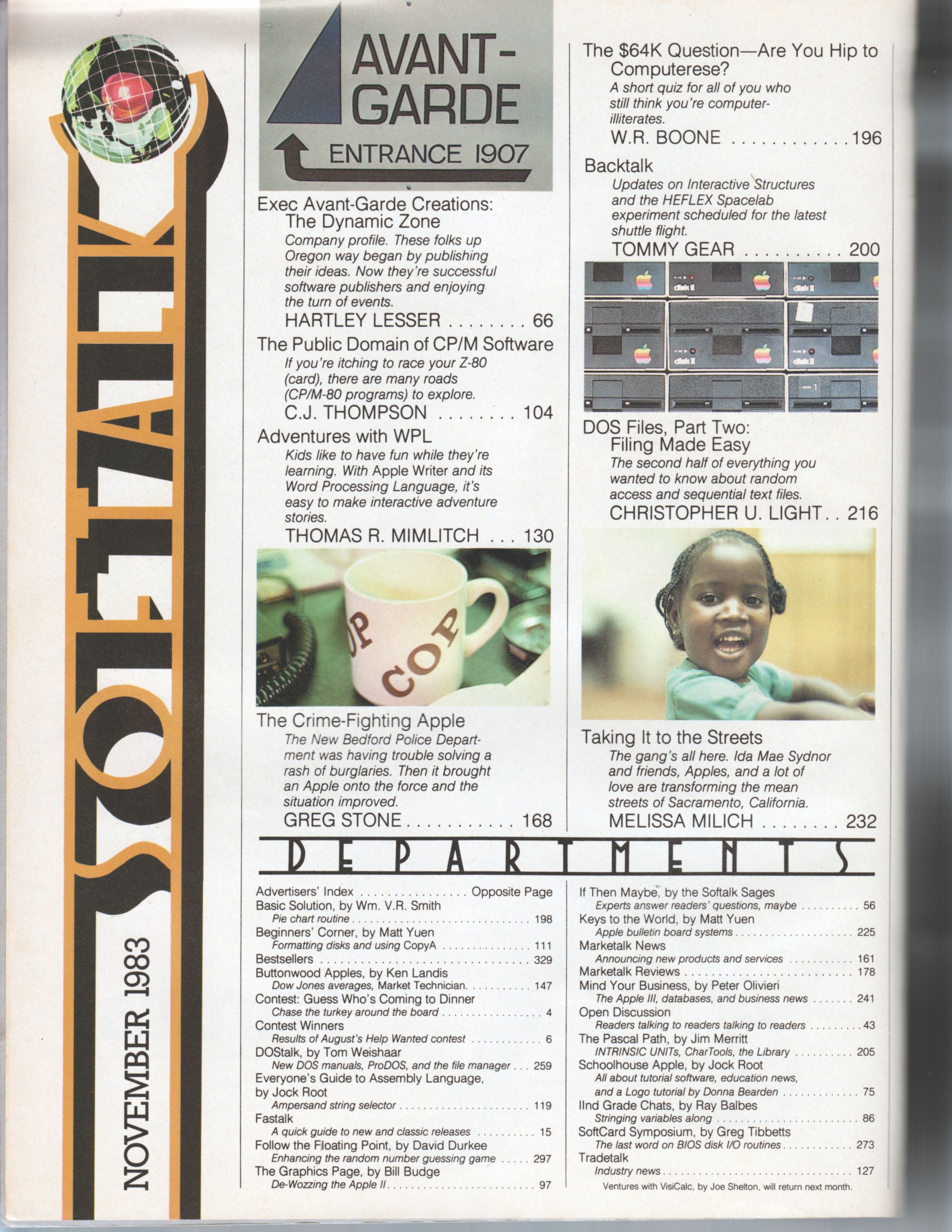 Exec Avant-Garde Creations: The Dynamic Zone. The Public Domain of CP/M Software. Adventures with WPL. The Crime-Fighting Apple (AKA Detective Story on the cover). The $64K Question — Are You Hip to Computerese? Backtalk. DOS Files, Part Two: Filing Made Easy. Taking It to the Streets. Hardtalk: An Evening with Remarkable Characters. Making Software Fit the Company — The Custom Connection. Getting To Know Your Stocks. Newspeak. Storytalk: In the Forest of the Night. Plus the usual Features and Departments including multi-category Bestseller lists.