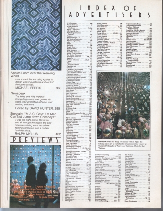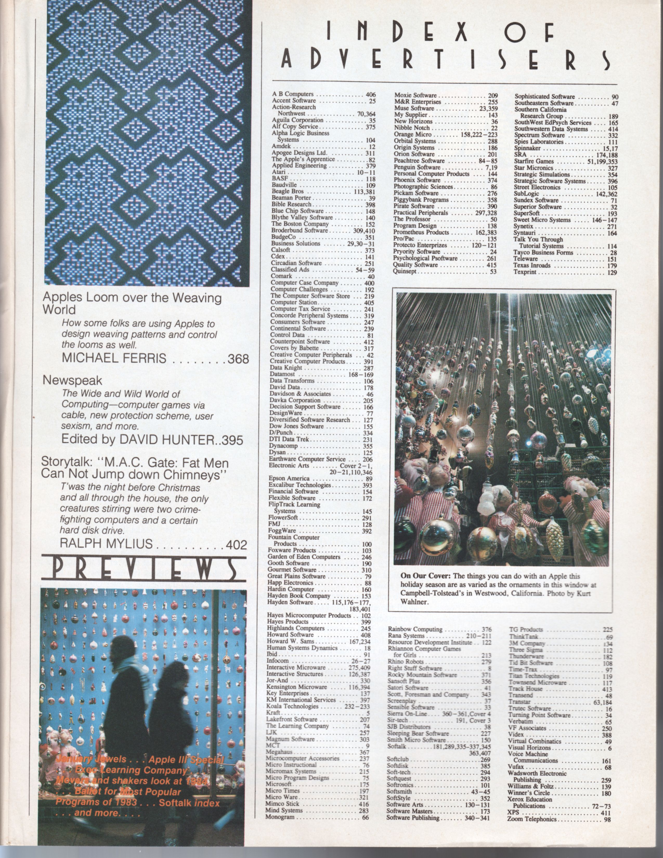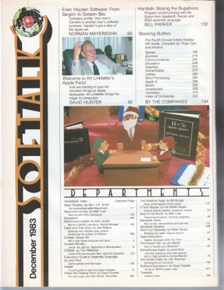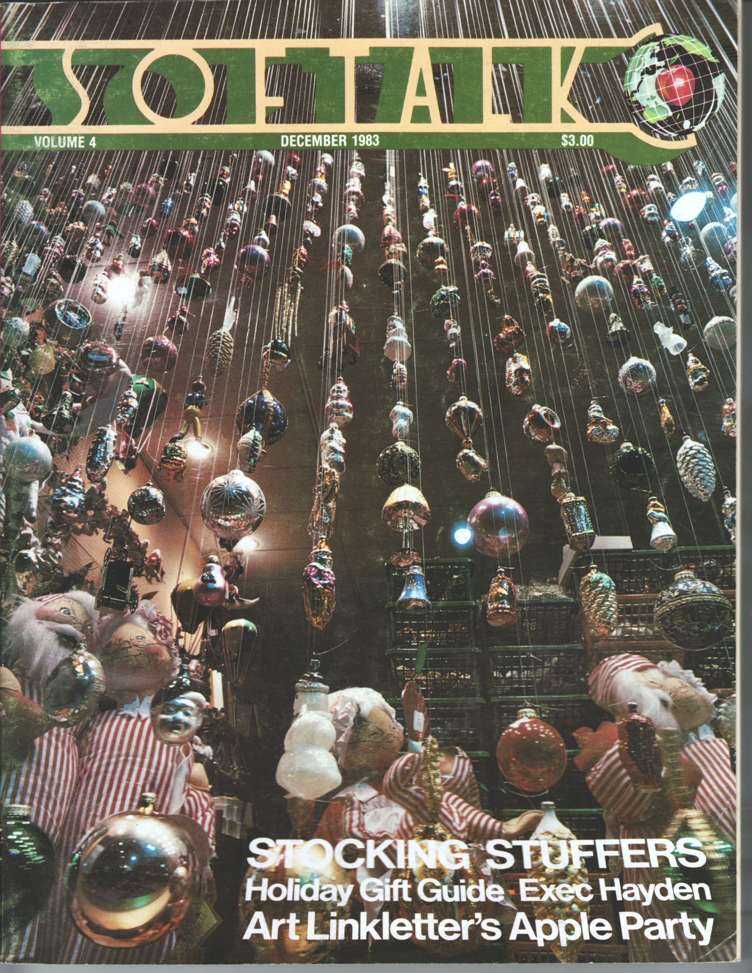 Exec Hayden Software: From Sargon to Sixteen Bits. Welcome to Art Linkletter’s Apple Party! Hardtalk: Boxing the Bugaboos. Stocking Stutters - The Fourth Annual Softalk Holiday Gift Guide. Apples Loom over the Weaving World. Newspeak. Storytalk: “M.A.C. Gate: Fat Men Can Not Jump down Chimneys”. Plus the usual Features and Departments including multi-category Bestseller lists.